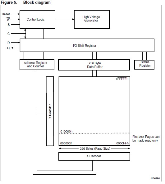 The M45PE16-VMW6TG is a 16Mbit (2M x 8 bit) Serial Paged Flash Memory accessed by a high speed SPI-compatible bus. The memory can be written or programmed 1 to 256 bytes at a time, using the Page Write orPage Program instruction. The Page Write instruction consists of an integrated Page Erase cycle followed by a Page Program cycle. TheM45PE16-VMW6TG is organized as 32 sectors, each containing 256 pages. Each page is 256 bytes wide. Thus, the whole memory can be viewed as consisting of 8192 pages, or 2,097,152 Bytes. It can be erased a page at a time, using the Page Erase instruction, or a sector at a time, using the Sector Erase instruction.